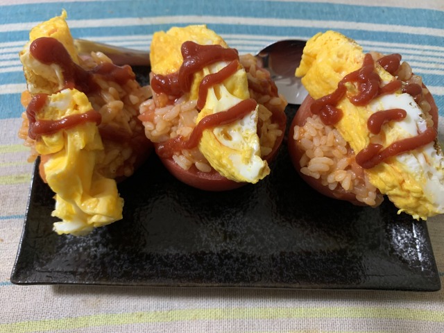 写真だと分かりにくいけどトマトをくり抜いてチキンライス詰めてます。